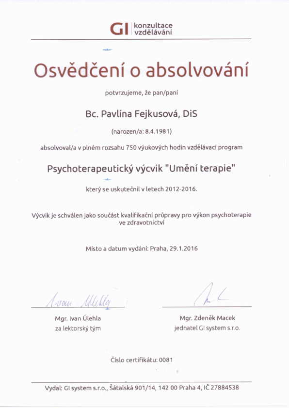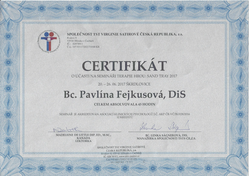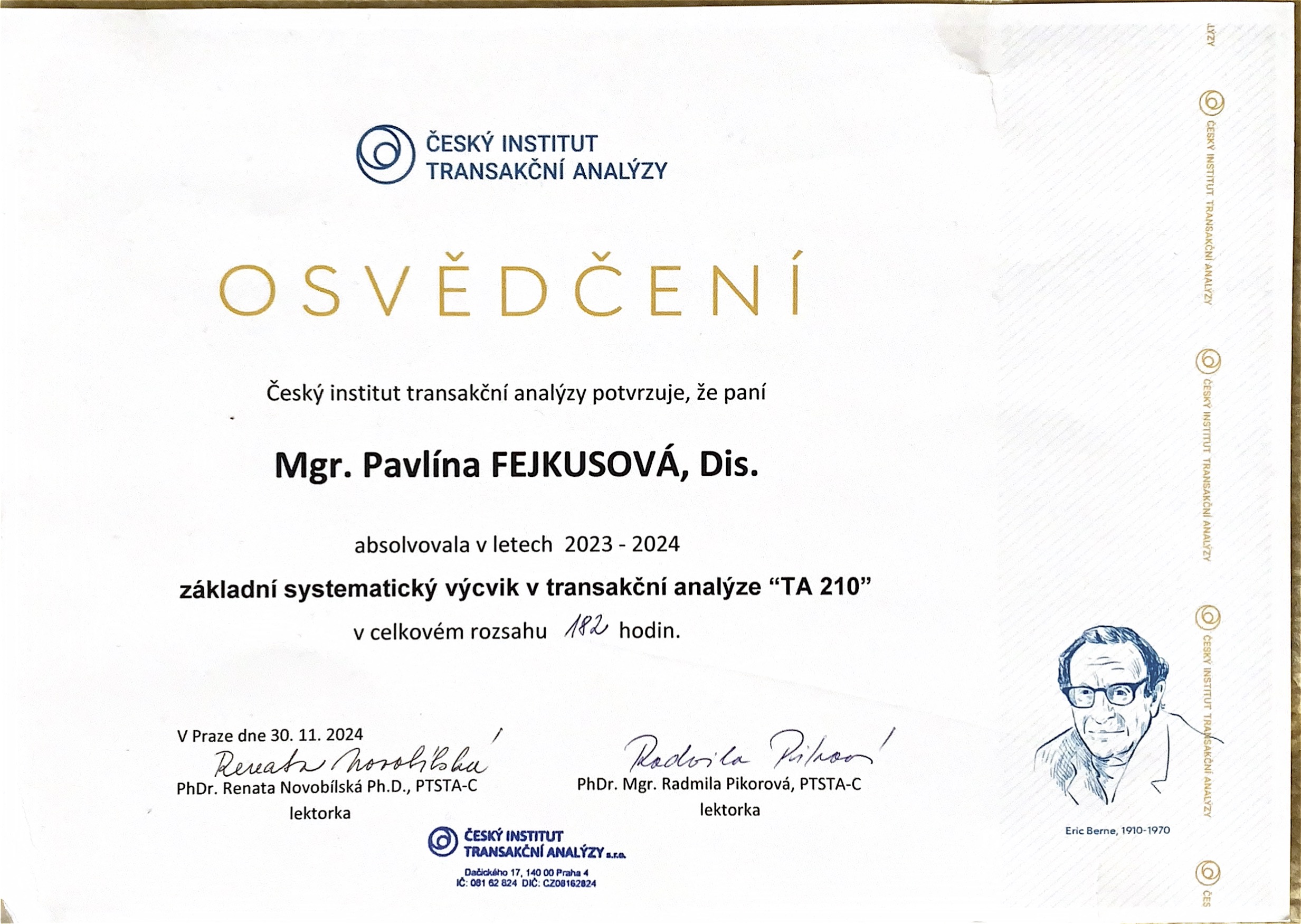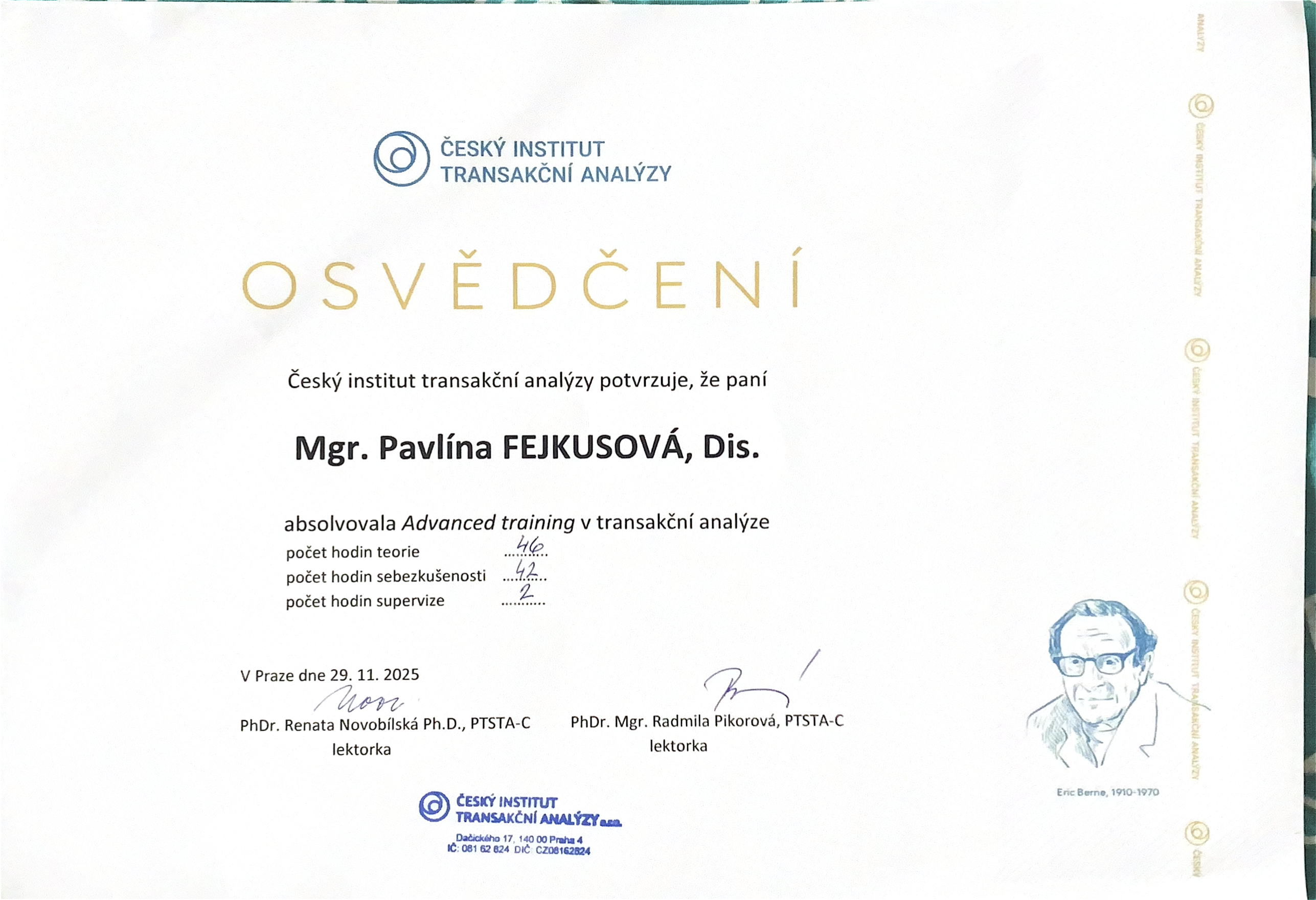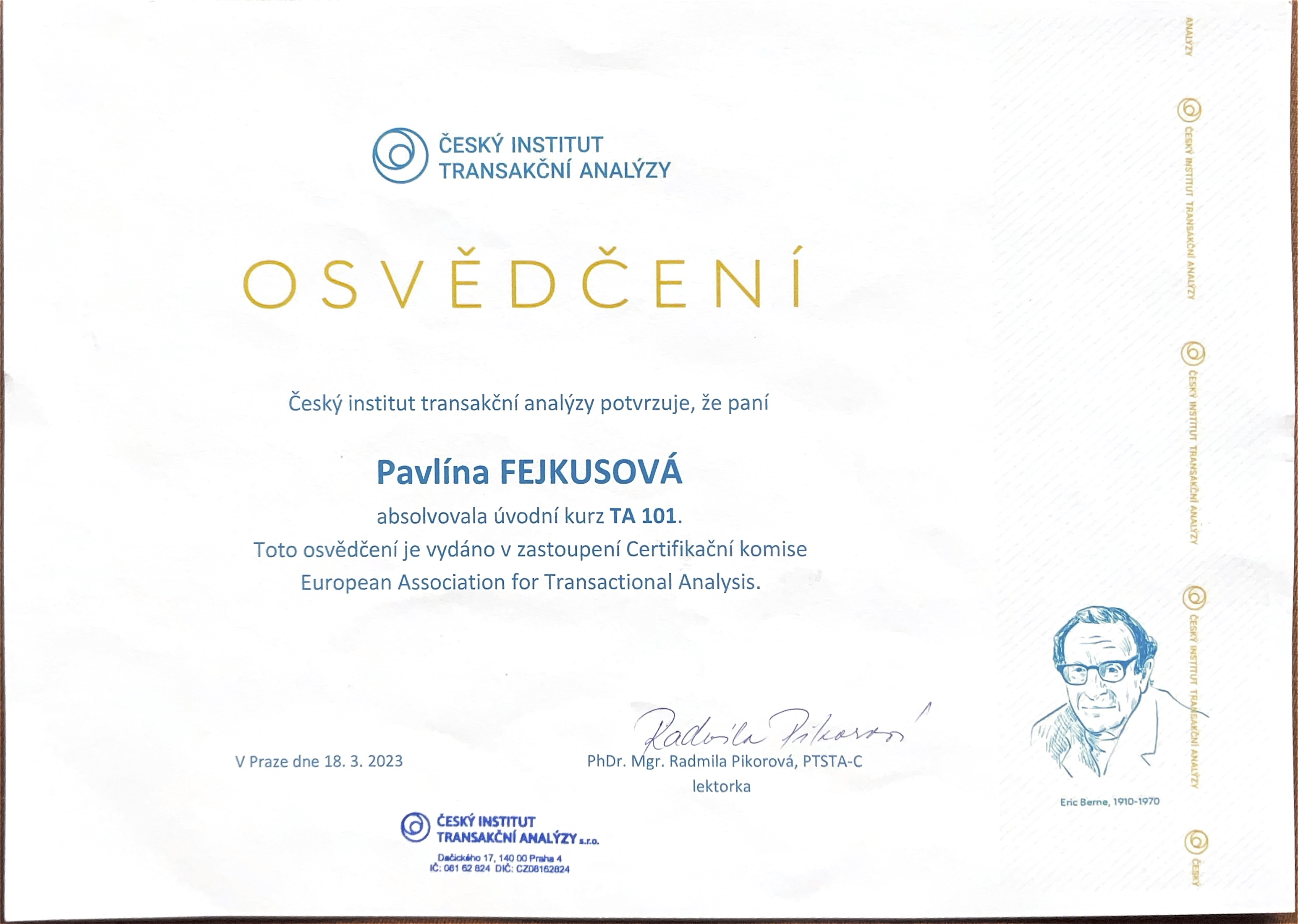 V současnosti jsem ukončila třetí rok vzdělávání v transakční analýze a připravuji se na zkoušky ke získání titulu Certifikovaného transakčního analytika (CTA).
